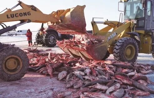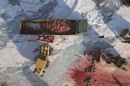 这场延续着古老渔猎智慧的冬捕,于1月6日拉开帷幕。1月15日,天未破晓,冰面上便已开始紧锣密鼓地筹备,直至近午时分,收网的号角正式吹响。绞盘隆隆作响,如远古的回响在冰原上震荡,千米渔网循着冰洞缓缓收拢,每一寸收紧都凝聚着劳作的力量。工人齐声喊着号子,身影在蒸腾的雾气中若隐若现,冰晶随动作纷飞,与弥漫的水雾交织成朦胧的轻纱。倏忽间,银鳞闪耀的鱼群如潮水般从网口奔涌而出,水花溅起又瞬间凝结,工人娴熟地将一尾尾肥美的活鱼挑至冰面,鱼儿在暖阳下不断跳跃翻滚,鲜活的生命力与繁忙的劳作场景相融,让这片冰封之地洋溢着最炽热的丰收欢腾。