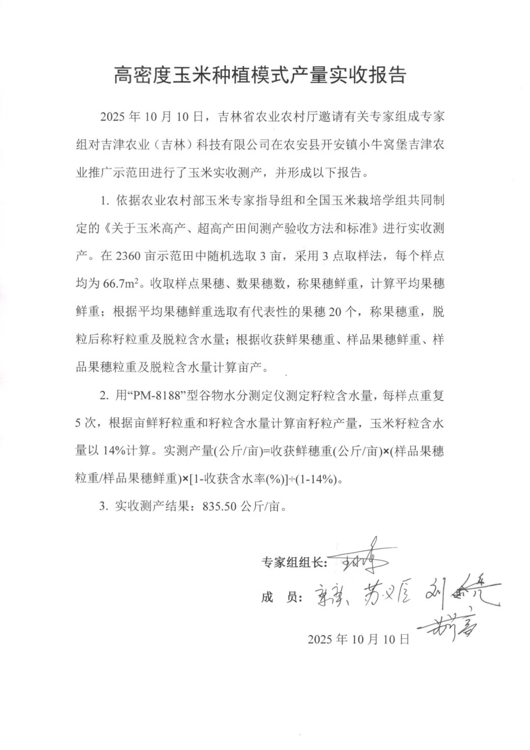 用“PM-8188”型谷物水分测定仪测定籽粒含水量,每样点重复5次,根据亩鲜籽粒重和籽粒含水量计算亩籽粒产量,玉米籽粒含水量以 14%计算。实测产量(公斤/亩)=收获鲜穗重(公斤/亩)x(样品果穗粒重/样品果穗鲜重)x[1-收获含水率(%)]-(1-14%),最终实收测产结果:835.50公斤/亩。 作为聚焦玉米黄金产业带(吉林、黑龙江、内蒙古、辽宁)的服务商,吉津农业的全产业链绝非“简单串联”,而是每个环节都嵌入硬核技术支撑。公司20余名核心专家,在作物种植管理环节,为每块托管地配备“物联网墒情监测设备+无人机植保团队”,墒情数据实时传输至云端,技术员通过APP远程指导浇水施肥,无人机精准喷施生物农药,既减少30%农药用量,又让病虫害防治效率提升2倍;加工端更有细分工艺——哈尔滨鲜食玉米加工厂采用“121℃巴氏杀菌+真空包装”锁鲜技术,让玉米保质期延长至6个月;吉林四平玉米食品厂则运用“低温挤压成型技术”,将玉米糁加工成无添加的玉米面条、玉米糊,产品直供东北连锁商超。 这样的技术布局,始终与政策导向同频。作为国家科技型中小企业,吉津农业不仅享受“吉林省科技型中小企业研发费用加计扣除”政策,每年可节省研发成本超百万元;还成功对接“东北玉米产业集群发展项目”,其在白城建设的滴灌厂,因符合“节水农业”政策要求,获得地方政府30%的设备补贴;在农户服务层面,公司的“全程托管模式”更是纳入“吉林省小农户与现代农业有机衔接试点”,农户加入托管后,除了享受技术服务,还能通过“订单农业”获得最低收购价保障。 “以前自己种,选种靠打听、卖粮靠贩子,现在吉津管全程,还有政策托底,咱种粮心里有底!”张喜凤的话道出了千余农户的心声。目前吉津农业已在吉林设3家服务公司、黑龙江与内蒙古各设2家,筹建的辽宁公司已落地也将接入当地“粮食产后服务中心”政策资源;累计服务农户超1000户、合作面积30万亩,通过举办“科技种田测产大会”,省农业农村厅邀请5名专家现场指导,让更多农户掌握“高密度种植+智能管理”的组合技术,今年已有200余农户因采用新技术,每亩增收超200元。 |