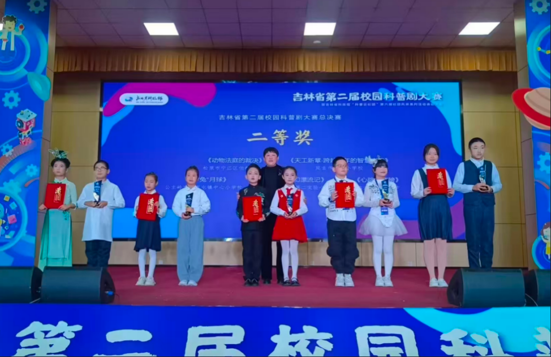 从选题阶段紧扣“知识科普”“航天启蒙”等前沿方向,到剧本创作中反复推敲科学内容的准确性与剧情的趣味性,再到利用课余时间反复排练、精心打磨表演细节——师生以严谨的态度和对舞台的热爱,确保了作品兼具科学内涵与艺术表现力。 赛场绽放 科学演绎见真章 2025年10月25日,参赛师生提前抵达松原赛区,在签到、抽签与彩排环节中迅速适应场地环境,认真调试道具、核对台词,以充分的准备迎接决赛挑战。孩子们眼中闪烁着对科学的向往,老师则全程细致指导,力求每一个细节都臻于完善。