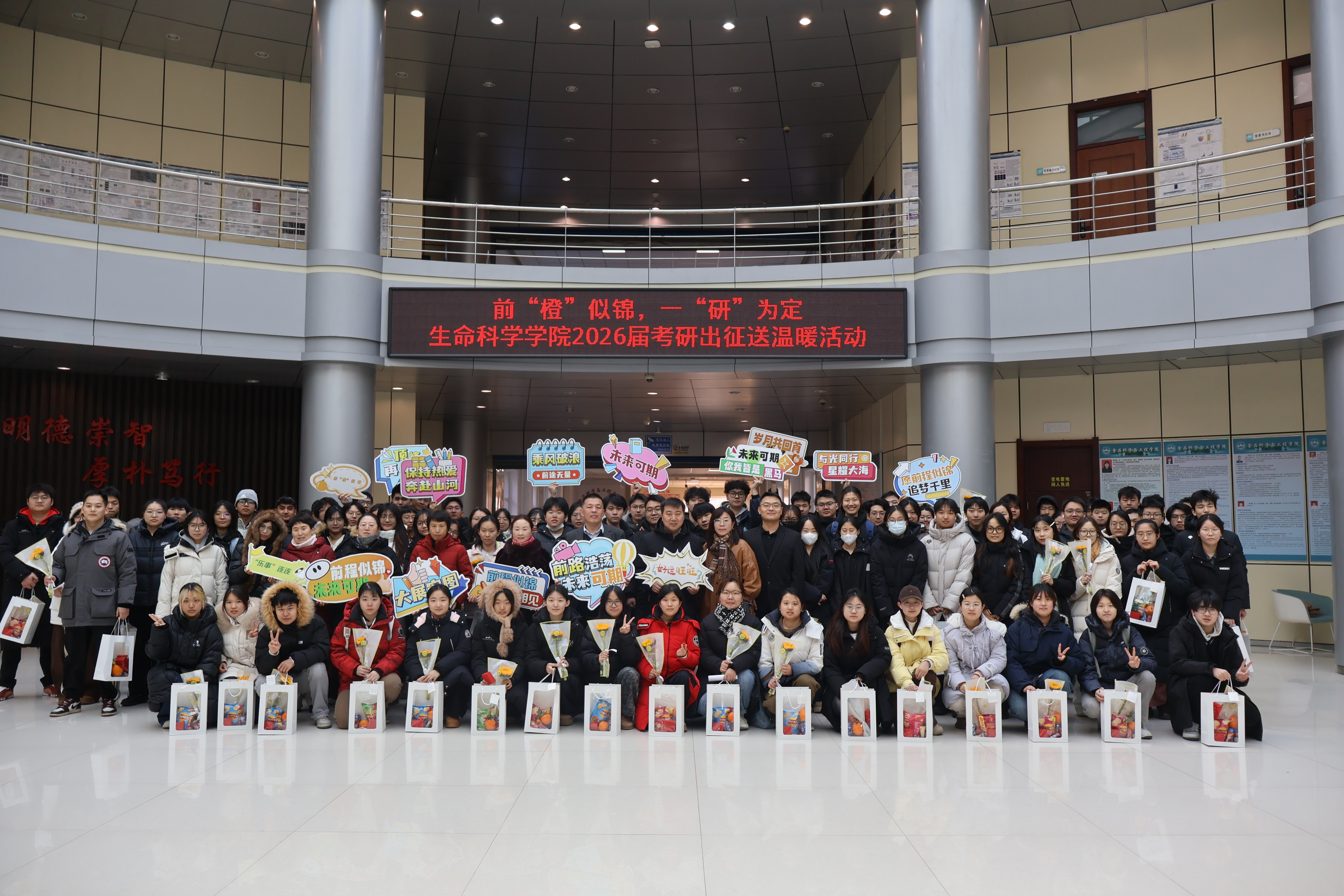 12月16日,吉林农业大学生命科学学院在理工楼大厅举办“前‘橙’似锦,一‘研’为定”2026届考研出征送温暖活动。学院领导班子、系主任和辅导员老师与备战考研的学子齐聚一堂,通过温馨的仪式和精心准备的祝福礼包,为即将奔赴考场的同学们鼓舞士气、传递温暖、坚定信心。
