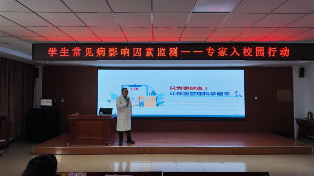 为积极响应“健康中国”战略高质量发展,进一步普及科学体重健康知识,有效增强青少年学生健康意识和自我保健能力,靖宇县人民医院在县域各中小学校冬季放假前期,组织健康教育团队分别走进县第三中学和县第一中学,以“科学减重·享‘瘦’健康”为主题,积极开展体重管理健康科普知识讲座,助力广大青少年学生度过一个健康、和谐、快乐的冬季假期。 健康教育讲座现场,靖宇县人民医院的专业医师采用学生们喜闻乐见的授课方式,以通俗易懂的语言,结合图文并茂的视频,深入浅出地阐述了健康体重的重要意义和科学减重具体方法,突出强调多数慢性疾病都源于青少年时期养成的不良饮食生活习惯,分享了控制体重、减少盐油摄入等健康生活方式,重点介绍了“三减三高”健康知识,并结合“膳食宝塔”内容,引导大家制定健康的饮食计划,提出合理饮食睡眠、远离电子产品、加强运动锻炼、注意心理调节等体重控制具体措施。