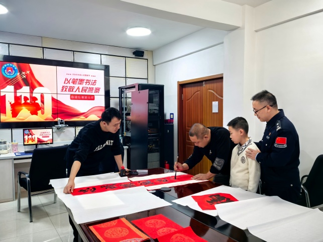 1月8日,在第六个“中国人民警察节”来临之际,白山边境管理支队临城边境派出所内暖意融融、墨香四溢。十余名辖区书法爱好者及社区工作者自发走进警营,以书法作品扮靓派出所文化长廊,提前共庆警察节。 活动现场,长桌铺展,宣纸轻铺。居民孙先生挥毫写下“赤诚护边关”五个苍劲大字,笔力沉雄,墨韵酣畅,将对移民管理警察扎根边疆的深深敬意凝于笔端;擅长楹联创作的李阿姨提笔写下“巡边踏雪保疆土,解忧纾困暖边民”的联句,字字恳切,道出了边民群众对民警守护平安、服务为民的双重礼赞。在场民警中的书法爱好者也欣然参与,与群众交替执笔、切磋技艺。