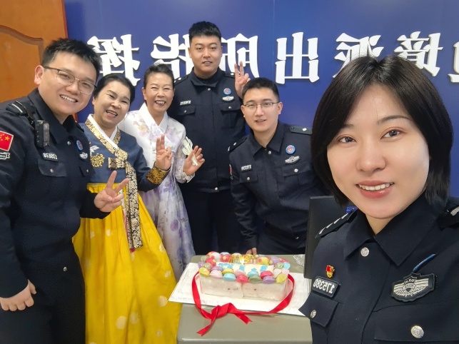 1月9日,冬日午后的暖阳下,白山边境管理支队马鹿沟边境派出所里迎来了一抹身影,朝鲜族大娘金顺玉提着沉甸甸的盒子,步履蹒跚地走进值班室,笑着将盒子递到民警手中:“孩子们,明天是你们的节日,这是我亲手做的月亮糕,祝你们警察节快乐!” 轻轻掀开盒盖,一股清甜香气扑面而来,只见一块洁白莹润的糕体之上,以蓝色月亮糕精心捏制而成的“1.10节日快乐”字样清晰浮现。月亮糕是朝鲜族传统特色美食,以细腻的米粉为皮,包裹香甜的红豆馅,不仅寓意着团圆美满,也有守护平安的美好含义。为了让民警吃上新鲜的月亮糕,金大娘凌晨五点就起床忙活,磨粉、和馅、塑形、蒸熟,每一个步骤都饱含着对民警的感激与祝福。
