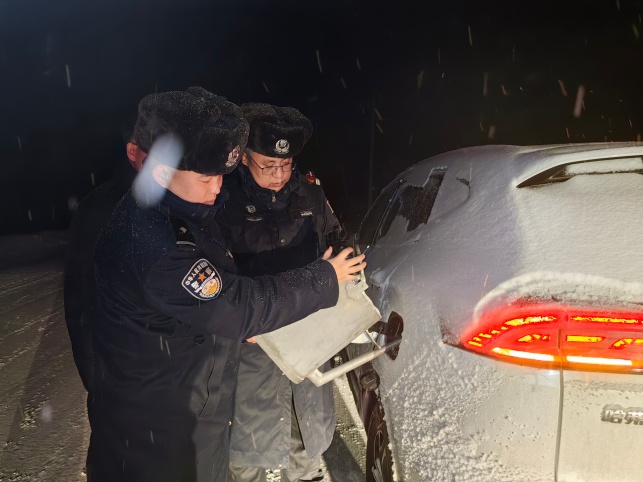 1月12日,长白县境内普降大雪,气温骤降。傍晚18时30分左右,白山边境管理支队长白镇边境检查站40公里卡点接到群众紧急求助,称在前方国道上,一辆SUV因燃油耗尽,被困在国道旁,无法前行。 接报后,执勤民警反应迅速,立即携带站内常备的应急救援汽油,驱车赶往现场。抵达后,只见一辆轿车熄火停在路边,驾驶员在寒风中焦急万分。民警第一时间确认现场安全及驾驶员身份,迅速取出汽油,熟练地为受困车辆进行加注。