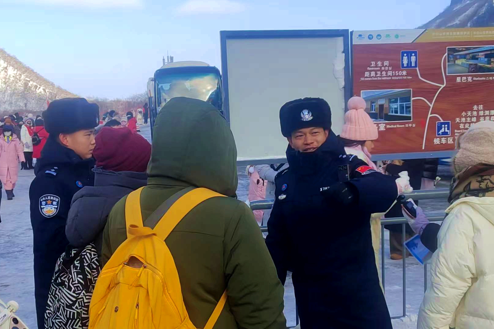 数九寒天,长白山银装素裹,粉雪皑皑。尽管气温骤降,但挡不住南方游客北上赏雪的热情。驻守于此的长白山边境管理支队靠前一步,以“在岗、在位、在状态”的坚守,用全方位安全保障筑牢冰雪旅游防线,让每一位游客在赏景之余,都能感受到安心与暖意。 “景点随处能看到警察,在这里游玩特别安心。”来自南方的游客宋先生的称赞,道出了众多游客的心声。为应对持续攀升的游客量,长白山边境管理支队动态研判辖区形势,严格落实24小时执勤巡逻制度,组织警力对边境一线、重点路段、人流密集区域开展常态化巡逻踏查与隐患排查。在景区外围和景区内,采取车巡与步巡相结合的方式,实现“见警察、见警车、见警灯”的全时段守护,让红蓝肩灯成为冰雪夜色中最安心的底色。