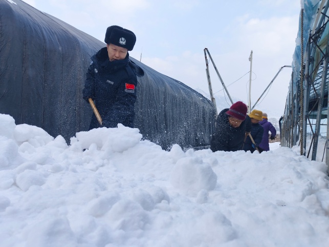 近日,临江市迎来强降雪天气,持续降雪在预示丰收的同时,也给农业生产带来了挑战。大栗子街道望江村的蔬菜大棚被厚重积雪覆盖,承压与透光问题令农户们忧心忡忡。 雪情即是警情。大栗子边境派出所迅速响应,主动对接村镇,组织民警力量奔赴田间地头,开展紧急扫雪除险工作。民警们不顾严寒,利用扫帚、雪铲等工具,仔细清理大棚顶部的积雪,并对棚架结构进行简易加固,全力防范坍塌事故,确保棚内作物正常采光。