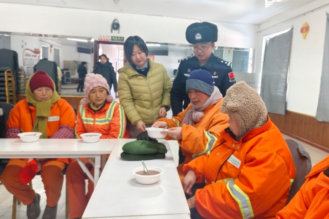 俗话说“过了腊八就是年”。为弘扬中华优秀传统文化,营造喜庆祥和的节日氛围,1月22日,白山边境管理支队大栗子边境派出所联合栗矿社区,共同举办“浓情腊八·爱暖人心”主题文明实践活动,邀请辖区环卫工人共聚一堂,同喝一碗粥,共话鱼水情。 清晨7时许,临江市栗矿社区新时代文明实践站的活动室里早已暖意融融,香气四溢。民警与社区志愿者们早早便开始忙碌,将提前数小时熬制好的腊八粥精心分装。红豆、糯米、莲子、桂圆……多种食材在文火慢炖中交融,化作一碗碗软糯香甜、饱含深情的“暖心粥”。当一碗碗热气腾腾的腊八粥被送到环卫工人手中,现场欢声笑语不断,暖意与感动在每个人心中流淌。