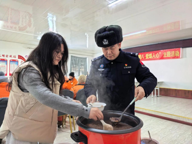 1月22日,大栗子边境派出所联合栗矿社区新时代文明实践站,举办“浓情腊八・爱暖人心”文明实践活动。清晨7时许,活动室里早已香气四溢,民警与社区志愿者将提前数小时熬制好的腊八粥精心分装,送到辖区环卫工人手中。 “这粥又甜又糯,喝下去浑身都暖和!”环卫工人李师傅捧着热粥,脸上洋溢着幸福的笑容。活动中,民警不仅为环卫工人送上保暖手套,向这群社区“美容师”表达敬意与感谢,还结合近期电信网络诈骗案例,重点讲解了针对老年人的养老诈骗手法,叮嘱大家守护好自己的“钱袋子”,平安过节。 1月23日,六道沟边境派出所组织开展“情暖腊八・致敬劳动者”慰问活动,将环卫工人邀请到派出所内,亲手递上热乎的腊八粥。民警与环卫工人围坐畅谈,关切询问他们的身体状况和生活需求,反复叮嘱冬季户外作业注意保暖防寒。 结合边境辖区治安特点,民警通过发放宣传手册、现场讲解等方式,普及最新边境政策法规和冬季安全防护要点。“这些安全知识太实用了,以后会多注意,也会跟身边人分享!”环卫工人李大姐的话语道出了大家的心声,警民之间的温情在寒冬中静静流淌。