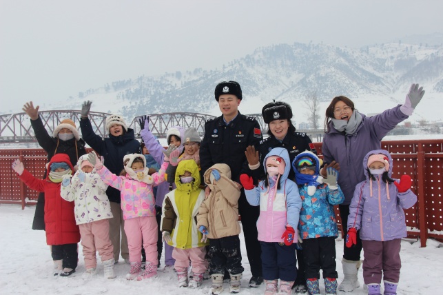 皑皑白雪覆盖着鸭绿江畔的边境小城临江,G331国道旁的红色地标在风雪中更显庄严肃穆。近日,白山边境管理支队新市边境派出所民警,化身“红色向导”与“安全卫士”,全程护航湖北恩施游学团,在口岸大桥、抗美援朝纪念广场、雪地与朝鲜族民俗体验中,为孩子们编织了一段跨越千里的温暖边关记忆。 在临江鸭绿江大桥上,民警指着江面积冰,向孩子们讲述70余年前“钢铁运输队”冒着炮火运送物资的抗美援朝往事,声音铿锵有力。孩子们屏息聆听、不时提问,眼神中满是对英雄的崇敬。随后在抗美援朝纪念广场,民警结合壁画与展板,生动再现了临江作为志愿军渡江地、战勤保障地的重要历史,让孩子们深刻理解“最可爱的人”的家国情怀。