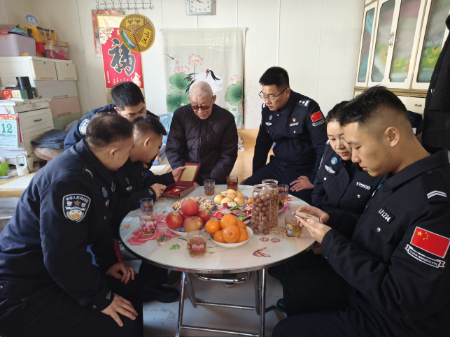 泱泱华夏,盛世中华。在举国同庆,阖家团圆之际,我们不能忘记曾经为了祖国统一,为了民族尊严不怕牺牲、英勇无畏的革命老前辈。春节前夕,为弘扬拥军优属光荣传统,扎实传递移民管理警察的关怀与温暖,2月12日,由八道沟边境派出所、十一道沟边境派出所与八道沟边境检查站组成的“两所一站”党建联盟组织民警代表联合开展辖区抗美援朝老战士走访慰问活动,为老英雄送上米、面、油等慰问品,致以节日的诚挚问候与崇高敬意。 慰问组一行来到长白县八道沟镇抗美援朝老兵李财玉家中。老人虽已年过九旬,但精神矍铄,看到慰问人员的到来,激动地回忆起当年在朝鲜战场上的峥嵘岁月。慰问组询问老战士的身体状况、家庭生活情况及实际困难,反复叮嘱老人保重身体、安享晚年,并向他们介绍了派出所和检查站近期在维护边境辖区治安稳定、排查化解矛盾纠纷、提升便民服务质效等方面的工作举措与成效。