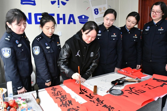 春风有信,花开有期。在“三八”国际劳动妇女节来临之际,为丰富警营文化生活,展现新时代移民管理女警风采,3月6日,临江大队精心组织开展了以“墨香润初心·花艺颂芳华·甜蜜聚警心”为主题的系列庆祝活动。大队全体女民警暂时放下繁忙的勤务,在翰墨飘香、花影摇曳与奶油甜蜜中,度过了一个温馨、雅致且充满意义的节日。 墨香抒怀,笔尖流淌忠诚 “沐雨栉风担重任,披星戴月护国门。”活动伊始,一场别开生面的书法展示率先拉开帷幕。在浓厚的文化氛围中,女民警们挥毫泼墨,将平日里的铿锵誓言化作笔底的行云流水。她们有的擅长楷书,笔力遒劲,书写出戍边卫国的坚定决心;有的偏爱行草,线条流畅,勾勒出对祖国山河的深情热爱。一幅幅寓意深刻的书法作品,不仅展现了女民警们深厚的文化底蕴,更彰显了她们“巾帼不让须眉”的豪情壮志。这副“巾帼担当”的联语,正是临江女警在长白山下、鸭绿江畔真实写照的艺术升华。