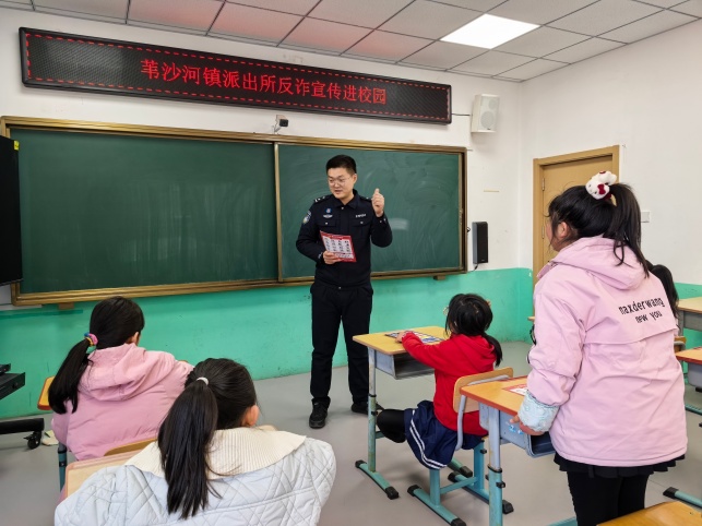 为切实筑牢校园反诈安全防线,提升中小学生识骗、防骗、拒骗能力,护航青少年健康成长,近日,白山边境管理支队苇沙河边境派出所组织民警深入辖区学校,开展“反诈宣传进校园”主题活动,为孩子们送上一堂生动实用的反诈安全课。 活动中,民警结合边境辖区实际与中小学生认知特点,聚焦游戏皮肤充值、账号交易诈骗、冒充老师收费、网络返利、陌生链接扫码等学生高发易受骗类型,用通俗易懂的语言、真实鲜活的身边案例,以案释法、以案示警,详细拆解诈骗分子的作案手法、话术套路与危害后果。民警现场与孩子们互动问答,手把手讲解“不轻信、不透露、不转账”的核心防骗准则,引导学生遇到可疑情况第一时间告知家长、老师或报警,不随意点击链接、不泄露个人信息、不向陌生账户转账。