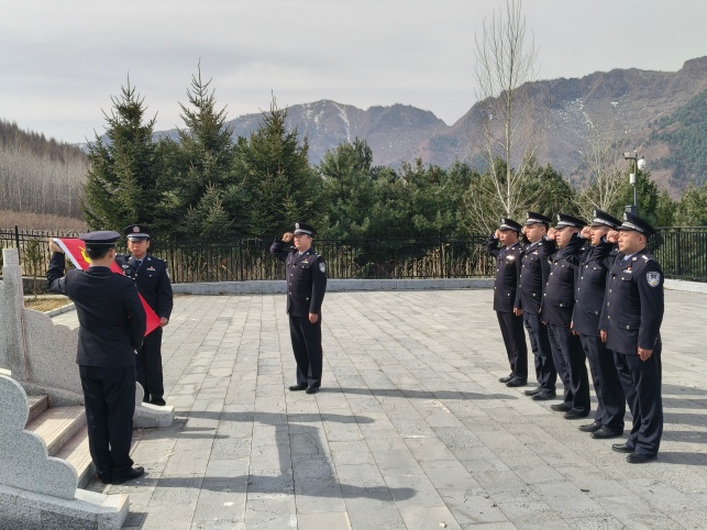 为深切缅怀革命先烈,传承红色基因,弘扬爱国主义精神,进一步增强民警的使命感和责任感,4月3日上午,长白朝鲜族自治县十二道沟边境派出所与十三道沟边境派出所组织全体民警,联合开展清明节祭扫活动,共同祭奠长眠于长白县烈士陵园的革命英烈。 上午9时,阳光明媚,松柏苍翠,烈士陵园庄严肃穆。来自两个派出所的10余名民警身着警服,整齐列队,手持鲜花,缓步进入陵园。在革命烈士纪念碑前,全体民警肃立默哀,向为民族独立、人民解放和国家安宁英勇献身的先烈们致以最崇高的敬意。 默哀毕,民警代表向烈士纪念碑敬献花篮,全体人员依次上前敬献鲜花,深切表达对革命先烈的无限哀思和崇高敬意。随后,全体党员民警在党旗下重温入党誓词,铿锵誓言回荡在陵园上空,彰显了新时代移民管理警察忠诚于党、服务人民的坚定信念。