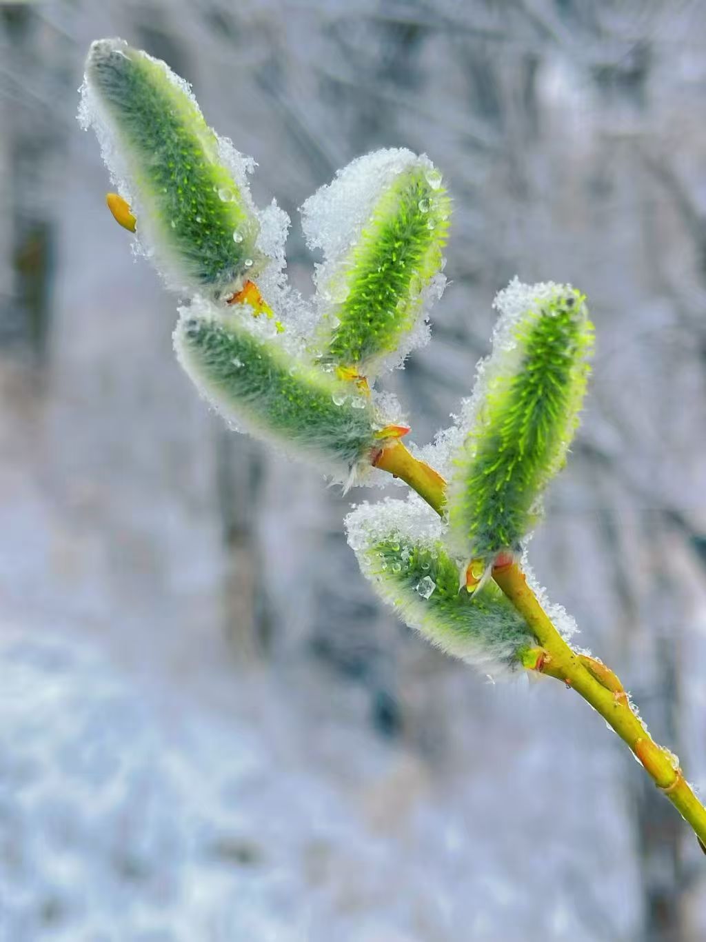 这场小雨,下得极有兴致,不慌不忙中让雨中的你感觉到温存的情调,浪漫的欢愉。夜色渐深,雨,依然轻轻歌唱,在你的梦中,雨魔术般变了手法,洒落的珍珠换成碎银,一夜功夫把大地和大地上自己能变颜色的植物统统着上了一层雪白的颜色。 清晨起来,晨练的路上,地面覆盖薄薄的一层雪,这种白,纯洁的、腼腆的白。行走在上面,脚下特有的酥软令你有所心动。花坛是白的,杨树柳树是白的,苍翠的松树也是白的,眼前冰雕玉砌的美景,把你融进一帧画面中。 清明,有这样的雪很少见,清明的景色独一无二。 冬天的雪与清明的雪极不相同,冬天的雪倘若积在树杈、树枝和叶子上,风一吹,雪就会“仙女散花”般的洒落。清明的雪,是黏在树枝、树杈上的,所有的树木就像用心镀上一种白。