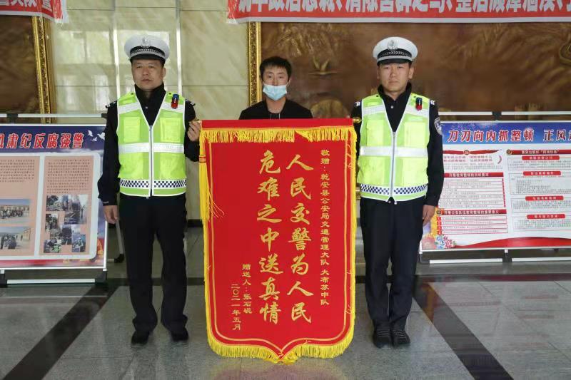 5月11日,乾安县道子乡知字村的张石硕家人,将一面印有“人民交警为人民,危难之中送真情”的锦旗亲自送到乾安县县公安局交通管理大队大队秩序民警手中,表达他们全家对乾安交警的由衷敬意。 事情是这样的,5月7日13时20许,乾安县公安局交管大队大布苏中队执勤交警王卫国、梁书硕,驾驶警车在G503国道巡逻至在字村西时,遇见对向车道一台捷达轿车向中队巡逻警车闪烁灯光,执勤交警立即将车停下。还没等交警询问情况,捷达车内群众就大声求救:警察同志我们车里有一名群众因干农活把手指筋割断了,现急需送到医院就医,怕路上堵车影响抢救时间,希望你们给予帮助。