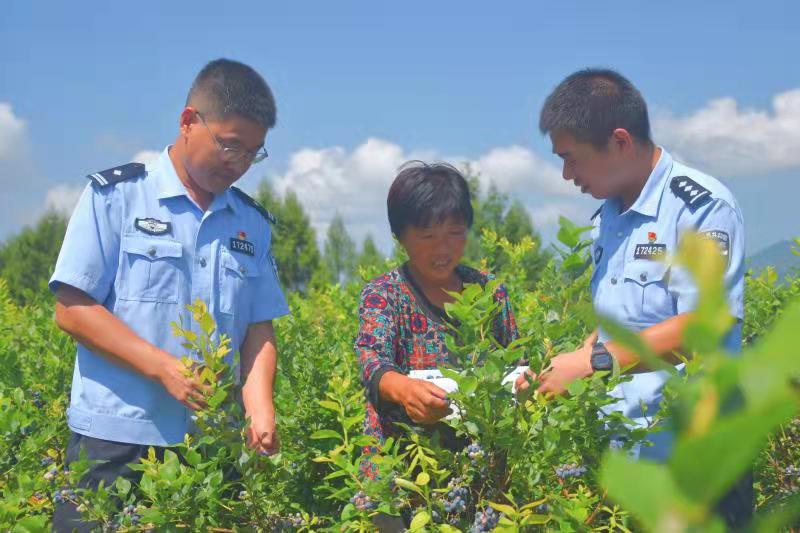 蓝莓地的“守护者” 今年6月开始,大棚蓝莓第一批成熟上市,7月份是蓝莓整体成熟高峰期,大量的游客、经销商从四面八方赶到宝山村采购蓝莓,宝山边境派出所合理地将警力安排在蓝莓种植地内外,及时、灵活地调整勤务模式,应对剧增的人流、车辆,对主要地段进行重点巡逻,把处于路边的果园作为重点“保护对象”。该所不仅对蓝莓种植区的安全监管下足功夫,还在采摘的高峰期成立“采摘帮扶队”,利用下班时间走进果园,为缺少劳动力的果农“搭把手”,与他们一起穿梭在蓝莓园采摘蓝莓,帮助他们解决采摘难题。