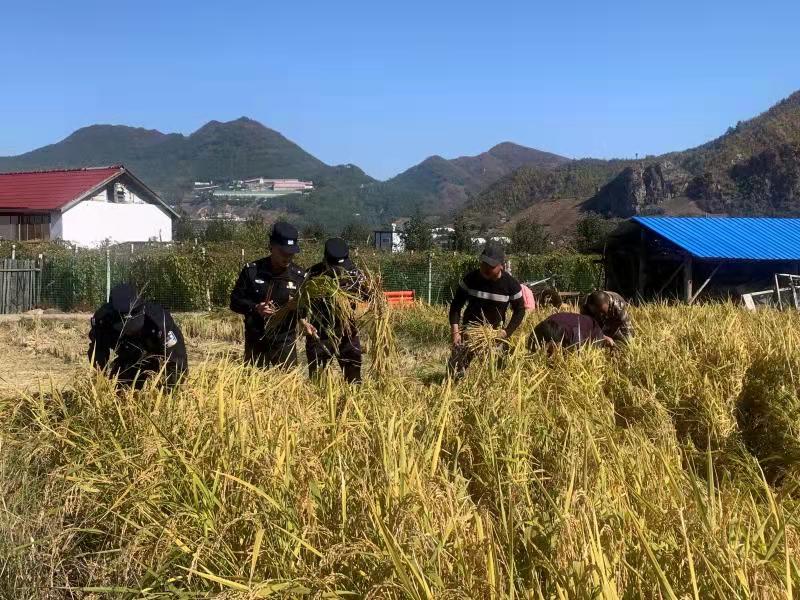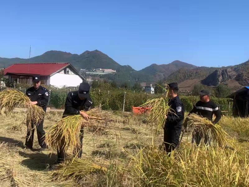 金秋时节来临,大栗子镇葫芦套村金黄的水稻田中,飘扬着阵阵稻花香,村民们在田野里来回穿梭,将一捆捆割好的稻谷搬运堆放,在这人群中,有一群身穿蓝色衣服的人也在抱着一捆捆稻谷忙碌着。 70岁的陈大娘看着自家田里丰收的稻谷,心里既高兴又着急。儿女外出打工,老伴年老体弱,农活的重担全压在她一个人身上,家里两亩田的稻谷收割起来着实困难。吉林白山边境管理支队大栗子边境派出所民警到辖区走访时得知该情况后,立即组织人员帮助老人收割稻谷。