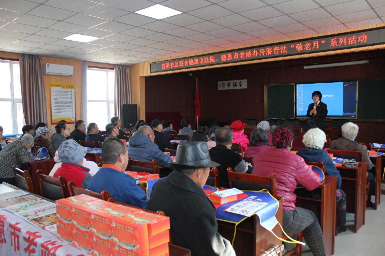 金秋送爽,情暖重阳。在全国“敬老月”之际,为切实提升老年人法治意识和维权能力,守护老年群体合法权益,10月23日上午,德惠市人民法院联合德惠市老龄工作委员会办公室,走进德惠市胜利街道前进社区,开展以“关爱老年人 法治伴我行”为主题的普法宣传活动,将法律知识与暖心服务送到老年人“家门口”。