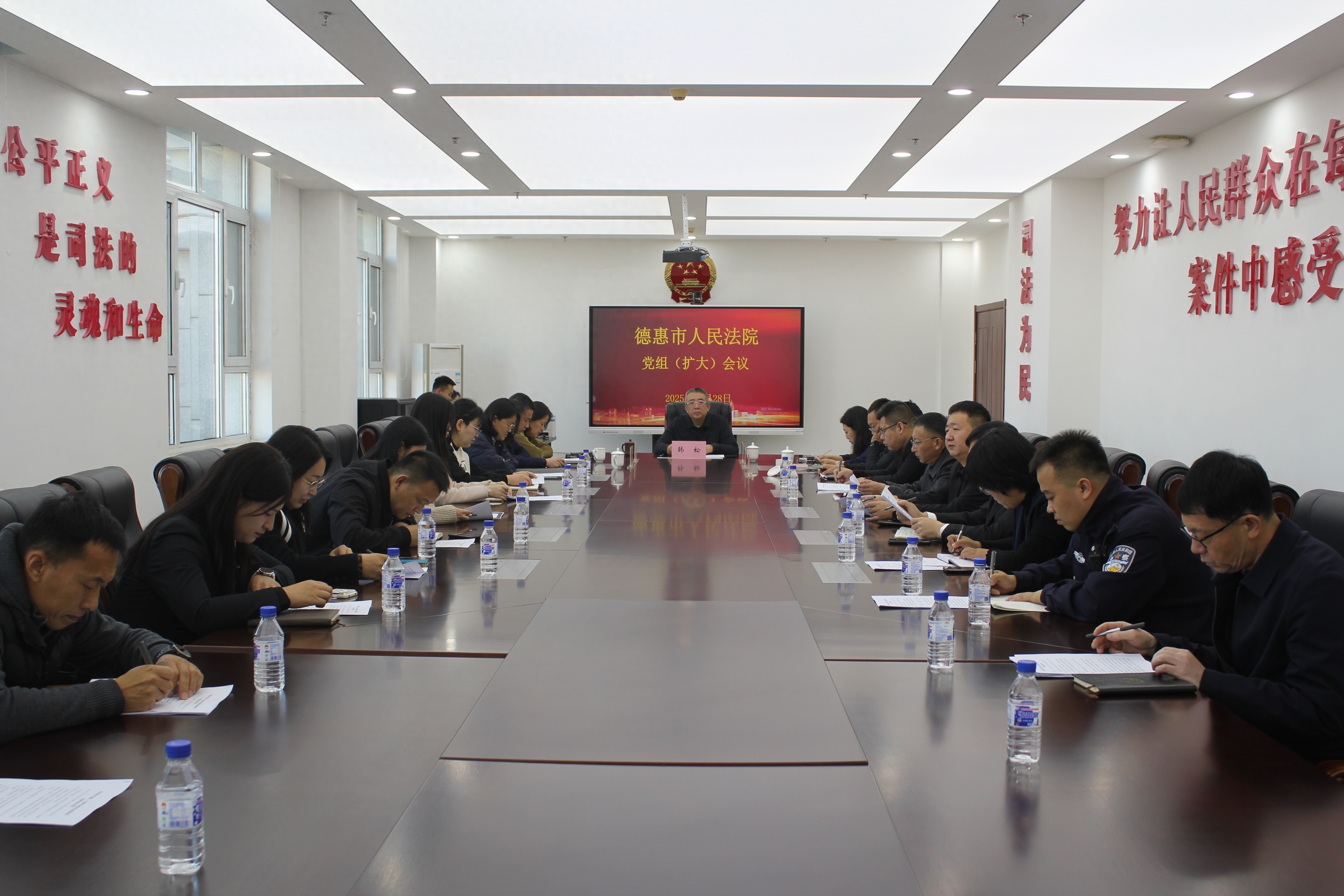 10月28日,德惠市人民法院召开党组扩大会,专题传达学习党的二十届四中全会精神,研究部署贯彻落实举措。党组书记、院长韩松出席会议并讲话,院领导班子成员及中层正职同志参加会议。