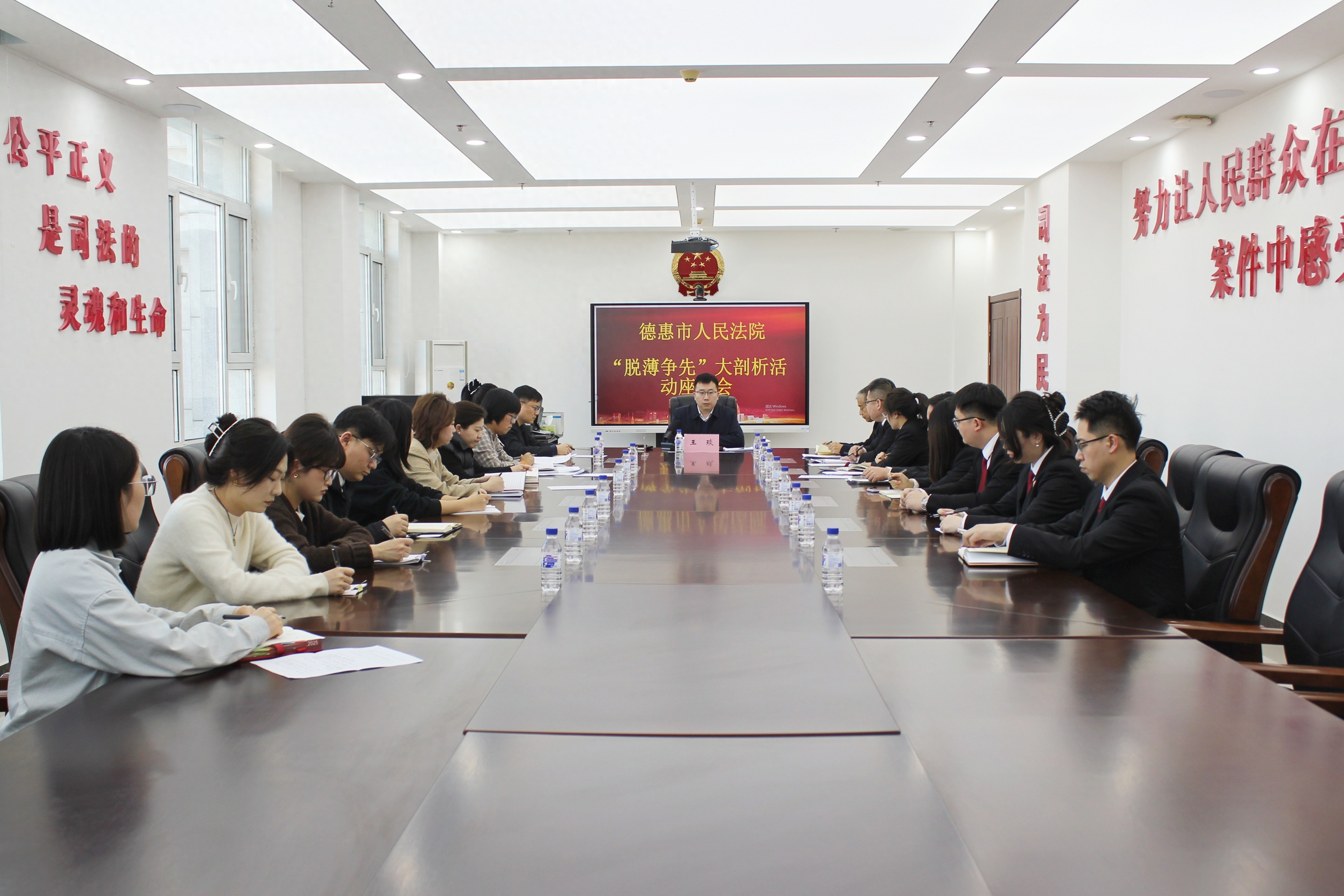 为深入贯彻落实上级法院关于相对薄弱基层法院建设的部署要求,德惠市人民法院坚持问题导向,全面剖析致薄根源,明确脱薄路径,激发内生动力。日前,在全院范围内开展“脱薄争先”大剖析活动。活动以座谈会为主要形式,覆盖刑事、民事、行政、执行、立案及综合等所有部门。会议由党组书记、院长王琰主持,分管院领导及各部门干警、文职人员参加会议。