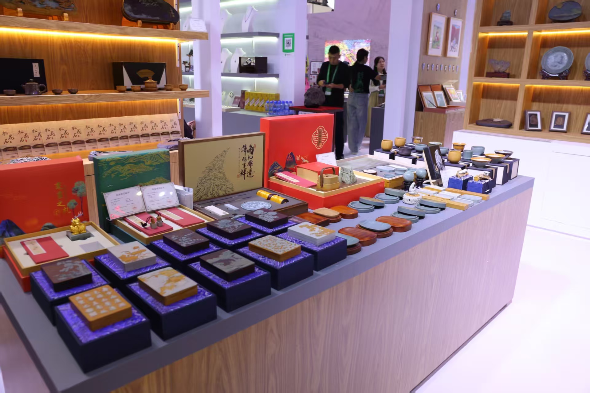 第十届中国国际版权博览会近日盛大启幕,白山市江源区作为区域特色文化代表携1000余件松花石展品精彩亮相,以独特的文化韵味为展会注入浓郁人文气息,成为现场备受关注的展区之一。 本届版博会以“数智引领未来,版权创新发展”为主题,汇聚全国多地文化机构、企业参与,规模创历届新高。白山江源松花石展区内,1000余件展品涵盖旅游纪念品、家居生活品、文创工艺品、观赏石及非遗作品五大类——既有雕刻精美、尽显传统工艺韵味的松花砚,也有融入现代设计理念、兼顾实用性与艺术性的手串、茶具等文创产品,满足不同观众的审美需求与认知兴趣。