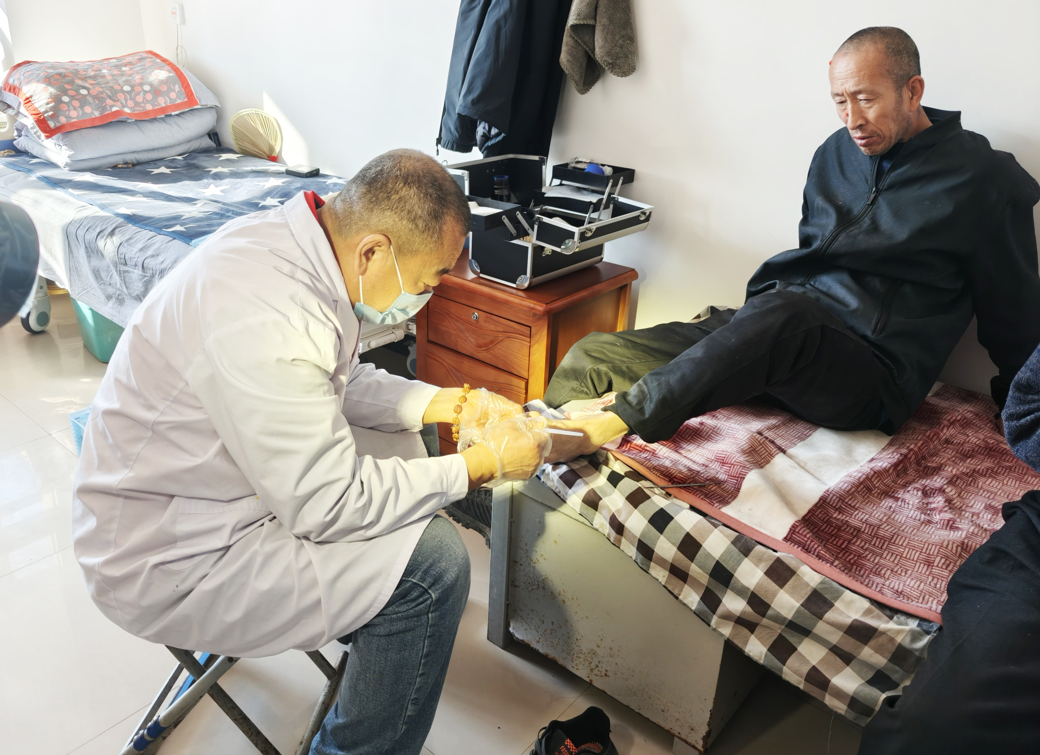 大家一起走进屋,杜大爷抢先坐到了床边,脱掉鞋袜让李季看:“杜大爷,你的脚是年轻时出力、挤压,导致脚变形。” 87岁的刘大爷耳朵有点儿背,坐在一边静静地等着,也不说话,当轮到他时,李季亲自为他脱鞋,刘大爷腼腆地说:“不用,不用,我自己来,要不我先洗洗脚吧?”李季边脱边说:“没事儿。”双手托起老人的脚,开始细心地修理、杀菌、上药、包扎,很快就修好了。刘大爷感激地一直拱手,说:“舒服多了,谢谢!” 祛痣后,李季叮嘱董叔:“每天可以正常洗,但不能用手挠。你的大脚指甲有些向内抠,修一修就好了,无大碍。” 李季耐心地为每一位老人修脚、嘱咐注意事项,房间里洋溢着浓浓的温情。