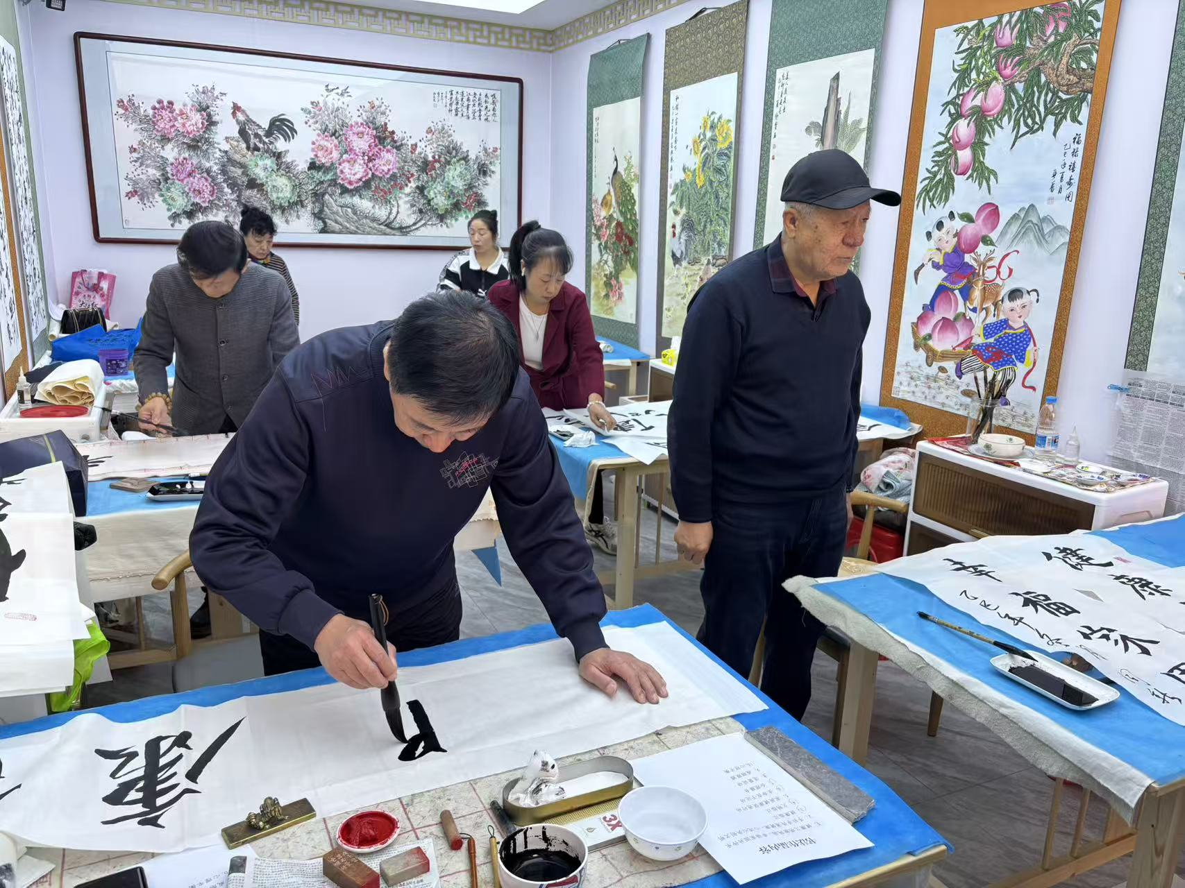 下半场活动聚焦文化赋能健康,文艺表演与书法绘画展示依次开展,为活动注入浓厚文化底蕴。首先上演的是社区居民自编自演的文艺节目,快板表演以明快有力的节奏,系统普及饮食均衡、文明新风等知识,内容通俗易懂且朗朗上口;舞蹈节目则以动感舒展的舞姿,生动传递积极向上的生活态度,现场氛围瞬间被推向高潮,赢得全场观众的热烈掌声。 文艺表演结束后,书法绘画展示区成为现场亮点。书法爱好者挥毫泼墨,以行楷书写“健康临江”“合理膳食”等字句,笔锋稳实又不失灵动,将对家庭健康的祈愿凝于笔墨,在笔墨书香中感受传统文化与健康主题的深度融合。