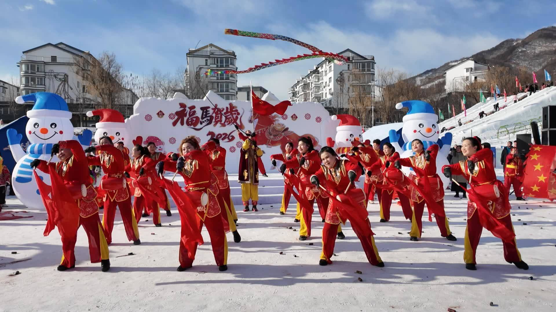 开业仪式在激昂的歌舞《爱我中华 鼓动中国》中拉开帷幕,铿锵鼓点与冰雪景致相映成趣,瞬间点燃现场热烈氛围。随后,传统秧歌表演火热登场,孙悟空、猪八戒等经典形象的融入,更为演出增添了灵动趣味。演员们身着绚丽彩装、手舞火红绸带,个个神采飞扬,将浓浓年味洒满整个冰雪乐园,让游客在尽享冰雪乐趣的同时,沉浸式感受中华优秀传统文化的独特魅力。