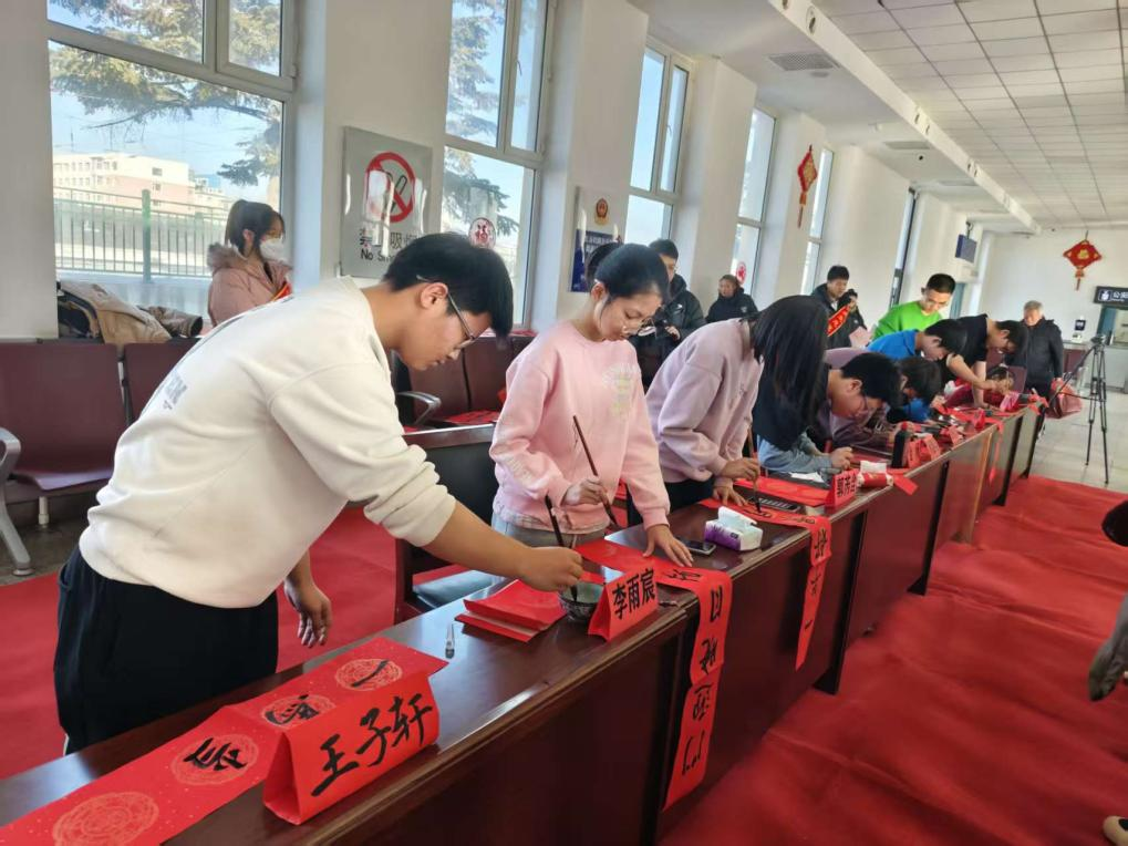 活动现场设置了“万福迎春”文化志愿服务环节和“传承榜样精神 凝聚奋进力量”主题宣传活动环节。德惠市老一辈书法爱好者带领兰亭书法社团的青少年书法爱好者及青少年志愿者,现场挥毫泼墨,写下一幅幅饱含祝福的春联、一个个寓意吉祥的“福”字,并有序分发给现场的旅客,让旅客们在墨香中感受浓浓的年味与关怀。吉林师范大学的大学生志愿者也积极参与其中,以原创漫画海报和故事讲解相结合的形式,生动讲述德惠革命英雄人物张义堂的事迹,让旅客们既感受到新春的暖意,也汲取到奋进的红色力量。