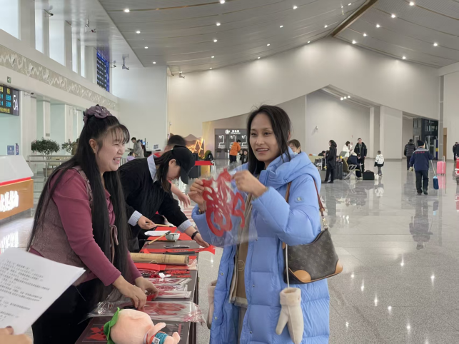 为进一步增强旅客参与感和体验感,抚松县文联于2月1日至2日同步开展系列互动活动,围绕抚松人参、优质矿泉水、冰雪旅游等特色资源设置有奖知识问答,赠送富有抚松元素的文创书签、明信片、特色冰箱贴和参团团毛绒玩具等文创产品。同时,组织抚松非遗传承人和书法爱好者现场开展剪纸、写春联等互动体验活动,将抚松传统文化和新春祝福送到旅客身边。