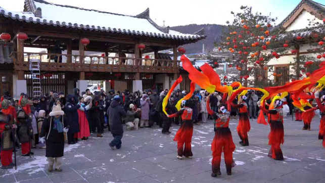 在全国4A级景区千年崖城风景区内,一场氛围感拉满、独具长白风情的“开城迎盛景 启运贺嘉年”新春开城仪式热闹启幕。身着传统服饰的“将士”肃立城门两侧,厚重城门缓缓开启,喜庆的传统秧歌红绸翻飞,活力满满的快闪舞步灵动欢快,八方宾客踏着铿锵鼓点涌入景区,在一步一景间感受历史底蕴与现代活力的鲜活碰撞,沉浸式体验独属于长白的新春文旅魅力。 “华服礼赞秀 宫廷宴写春”活动中,国风音乐悠扬奏响,模特身着精美华服款款走来,将中华传统服饰之美与长白地域特色完美融合。古色古香的景区布景中,书法家现场挥毫写春,民警、游客、志愿者一同将红彤彤的春联贴上古城门窗。墨香与年味交织,历史与当下相融。