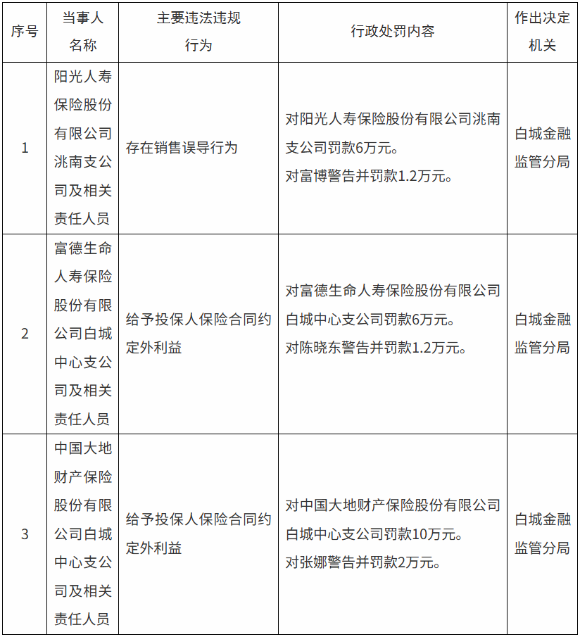近日,白城金融监管分局依法对辖区内三家保险公司分支机构及相关责任人员作出行政处罚,严厉整治保险行业违法违规行为,规范金融市场秩序。 阳光人寿保险股份有限公司洮南支公司及相关责任人员富博,因存在销售误导行为,被白城金融监管分局处罚:对该支公司罚款6万元,对富博给予警告并罚款1.2万元。 富德生命人寿保险股份有限公司白城中心支公司及相关责任人员陈晓东,因给予投保人保险合同约定外利益,被白城金融监管分局处以罚款6万元,同时对陈晓东给予警告并罚款1.2万元。 中国大地财产保险股份有限公司白城中心支公司及相关责任人员张娜,因存在给予投保人保险合同约定外利益的违法违规行为,被白城金融监管分局处罚:对该中心支公司罚款10万元,对张娜给予警告并罚款2万元。 此次系列行政处罚均由白城金融监管分局依法作出,旨在强化金融监管效能,督促保险机构及从业人员坚守合规经营底线,切实维护金融消费者合法权益和辖区金融生态稳定。 |