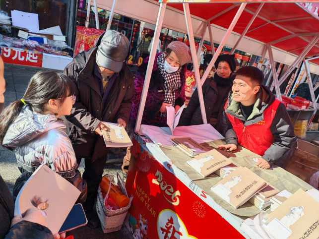 为纪念濛江县易名靖宇县80周年,2月12日,靖宇县委宣传部、县新时代文明实践中心、县文化广播电视和旅游局,在靖宇县步行街年味浓郁的新春市集现场,开展“烟火市集传红脉靖宇精神润新春”主题文明实践活动,通过英雄事迹宣讲、史料发放、互动问答、快板表演等形式,将红色基因融入新春佳节,让群众在置办年货的同时,沉浸式感悟杨靖宇将军的英雄壮举与靖宇县的英雄城底蕴,让红色精神为新春增添厚重底色。 活动现场,理论宣讲志愿者以“一刻钟宣讲”的形式,围绕杨靖宇将军的英雄事迹与靖宇县名的由来展开生动宣讲,用通俗易懂的语言还原革命先烈浴血奋战的峥嵘岁月,深刻阐释靖宇县作为英雄城的红色根脉。靖宇县学雷锋服务驿站的红领巾宣讲员则用快板的形式向群众讲授英雄故事,将杨靖宇将军在冰天雪地中与敌人顽强周旋、宁死不屈的壮烈情节,化作朗朗上口的韵词,每一个字都饱含着对英雄的崇敬,每一段节奏都传递着红色精神的力量。工作人员同步向过往群众发放《靖宇县抗联史料文集》,让红色史料成为群众了解本土革命历史的“鲜活教材”,引导大家从字里行间汲取奋进力量,赓续红色血脉。