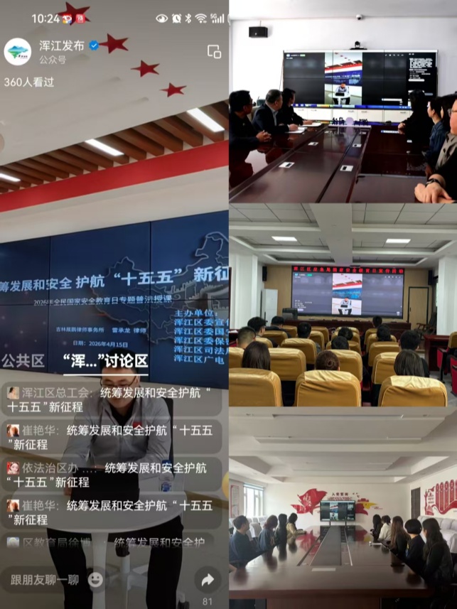 在第十一个“全民国家安全教育日”来临之际,为深入贯彻落实总体国家安全观,增强全民国家安全意识和法治素养,浑江区委全面依法治区委员会办公室精心策划、多方联动,以学习宣传习近平法治思想为指导,组织开展以“统筹发展和安全护航‘十五五’新征程”为主题的普法宣传活动。 走进网络:打造“云端”普法新阵地 “各位网友大家好,欢迎来到浑江区国家安全法治直播间……”在浑江区习近平法治思想学习宣传教育基地以“统筹发展和安全护航‘十五五’新征程”为主题开展直播普法讲座。活动由浑江区委宣传部、浑江区委国安办、浑江区委保密办、浑江区司法局、浑江区广播电视服务中心联合主办,特邀吉林展鹏律师事务所的资深律师走进直播间,精选网络安全、数据安全、政务保密、边境安全、反间谍五大领域典型案例,逐一的同时,结合公职人员岗位职责,提出可执行、可落地的行为准则与日常禁忌,明确必须做与坚决不能做的事项。剖析案情细节与危害后果活动覆盖各镇街、区直60余个部门,110个新时代文明实践中心(所、站)工作人员、志愿者以及村(居)“法律明白人”2000余人次参与观看。这种“屏对屏”的讲解方式,有效推动了国家安全知识从“云端”流入“心间”。